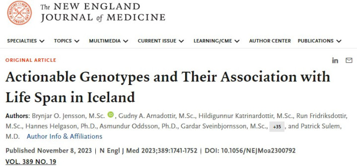 该磋议对5.8万名采纳了全基因组测序的冰岛东谈主进行了探听,凭据好意思国医学遗传学与基因组学学院指南内73个可操作基因列表,发现4%的冰岛东谈主在其中一个、多个基因内佩带可操作基因型。这诠释,平均每25个东谈主就有1个可操作的基因型,而这个基因可能会对寿命产生遍及的影响。