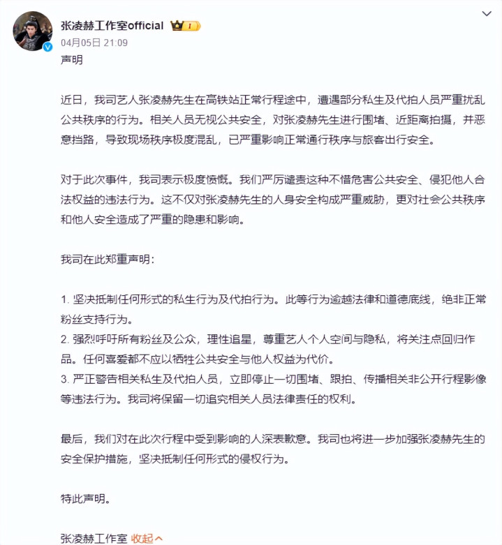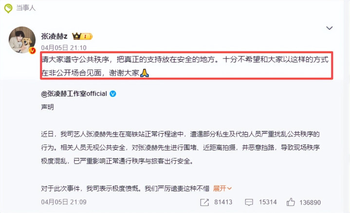 张凌赫在高铁站遇到围堵、近距离拍摄,关系东谈主员坏心挡路导致现场顺次高出杂沓,使命室发声明:坚韧抑遏任何样貌的私生活动及代拍活动.红星新闻