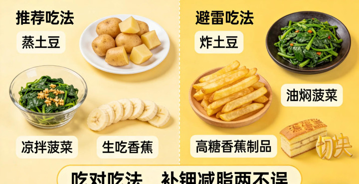 一把簇新菠菜钾含量约558毫克,远超巨额绿叶菜。减脂期服法以焯水凉拌、清炒鸡蛋为主,低温烹调能保留钾元素,且吸油少、热量低,既能补钾,又能补充膳食纤维,促进肠谈蠕动。