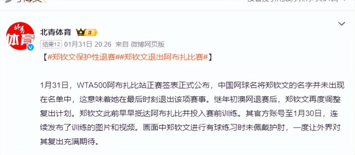 2026年1月31日,WTA500阿布扎比站签表公布,郑钦文缺席,这是她继1月8日退出澳网后,连续第二站退赛。