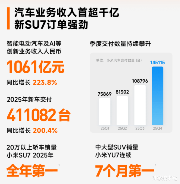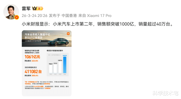 把柄官方的财报泄漏,小米汽车业务客岁营收卓越千亿,具体数据为1061亿元,而小米汽车客岁委派41万辆。