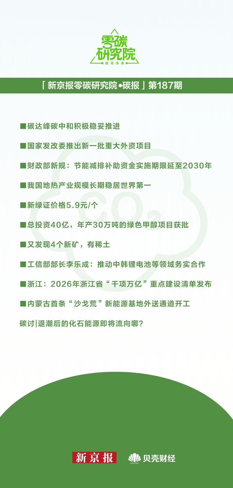 近日,《对于2025年国民经济和社会发展贪图执行情况与2026年国民经济和社会发展贪图草案的叙述》全文公布。叙述指出,碳达峰碳中庸积极稳当鼓励。完善碳排放总量和强度双限定度体系,塌实开展碳排放统计核算,开展碳排放预算试编制。更动固定资产投资款式节能审查和碳排放评价见地,强化新上款式用能和碳排放源泉把关。发布第二批国度碳达峰试点名单,开展第一批国度级零碳园区成立,发展以绿色动力制造绿色家具的“以绿制绿”新模式。鼓励绿色低碳先进本事示范款式成立。加速可再纯真力发展,可再纯真力装机达到23.4亿千瓦、占世界电力总装机60.1%,新增风电、太阳能发电装机容量4.3亿千瓦、占新增总装机比重80.4%,全年可再纯真力发电增量初度进步全社会用电增量。优化集会式新动力发电市集报价机制。推动可再纯真力绿色电力文凭市集发展。新式储能装机界限达到1.36亿千瓦。积极安全有序发展核电,核准在建在运机组界限位居世界第一。稳步扩大世界碳排放权来回市集行业掩盖范围,全年累计配额成交量2.35亿吨、成交额146.3亿元。扩大世界温室气体自愿减排来回市集救援领域,全年累计成交量922万吨、成交额6.5亿元。编制要点家具碳脚迹核算圭臬,上线国度温室气体排放因子数据库。单元国内生产总值二氧化碳排放缩短5.0%,非化石动力消费占动力消费总量比重21.7%。发布《碳达峰碳中庸的中国行动》白皮书。