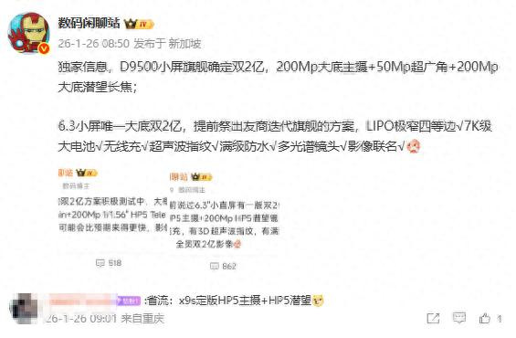 据知名数码博主@数码闲聊站 最新发布的信息显示,有款搭载天玑9500处理器的新机将后置双2亿像素大底摄像头。后置镜头组合分别是:2亿像素大底主摄、5000万像素超广角镜头及2亿像素大底潜望式长焦镜头。结合此前相关爆料以及评论区的信息来看,该机很可能就是已经有不少曝光的全新OPPO Find X9s。据悉,该机将采用三星ISOCELL HP5传感器,这是全球首款搭载该规格的2亿像素传感器,其光学格式为1/1.56英寸,有效分辨率达16384×12288,将分别用于主摄和潜望式长焦镜头。