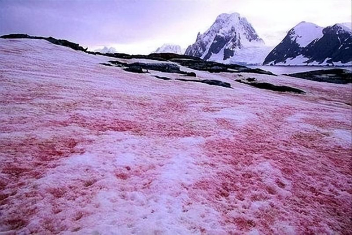 2、阿尔泰山西瓜雪:夏令部分峻岭雪地呈现粉红色,因雪衣藻(一种嗜冷微生物)在低温下大皆养殖导致,看起来像西瓜汁洒在雪上。