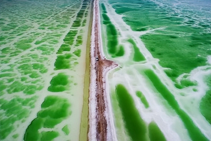 4、察尔汗盐湖(青海):中国最大盐湖,盐层厚数十米,盐储量够各人东谈主吃约 2000 年;湖面硬实如水泥地,青藏铁路、公路笔直从湖面上穿过。