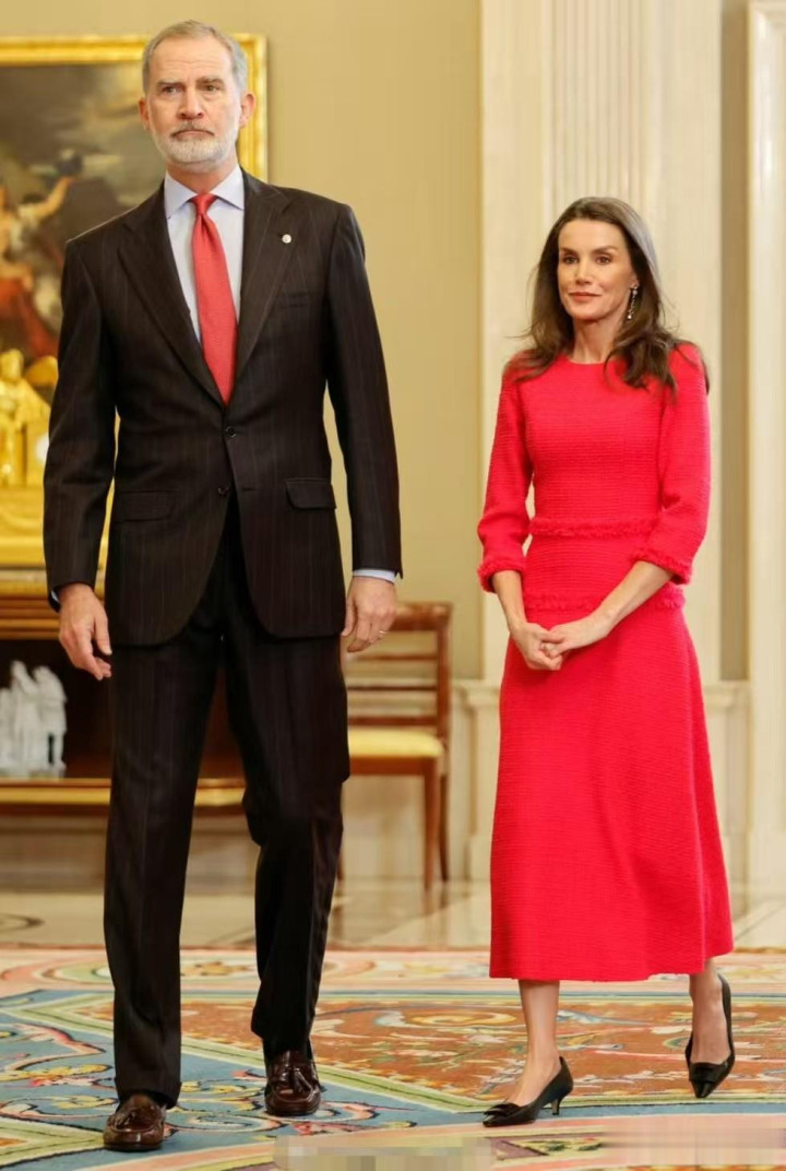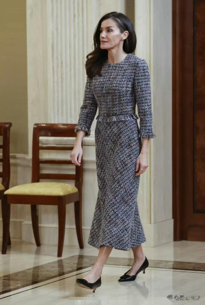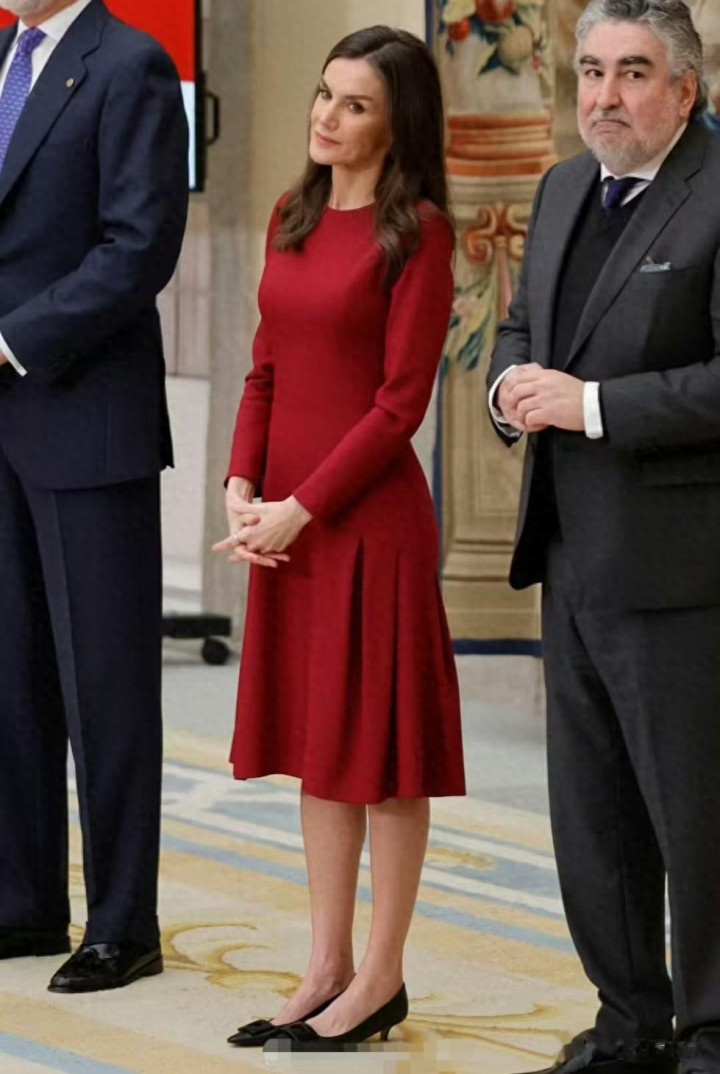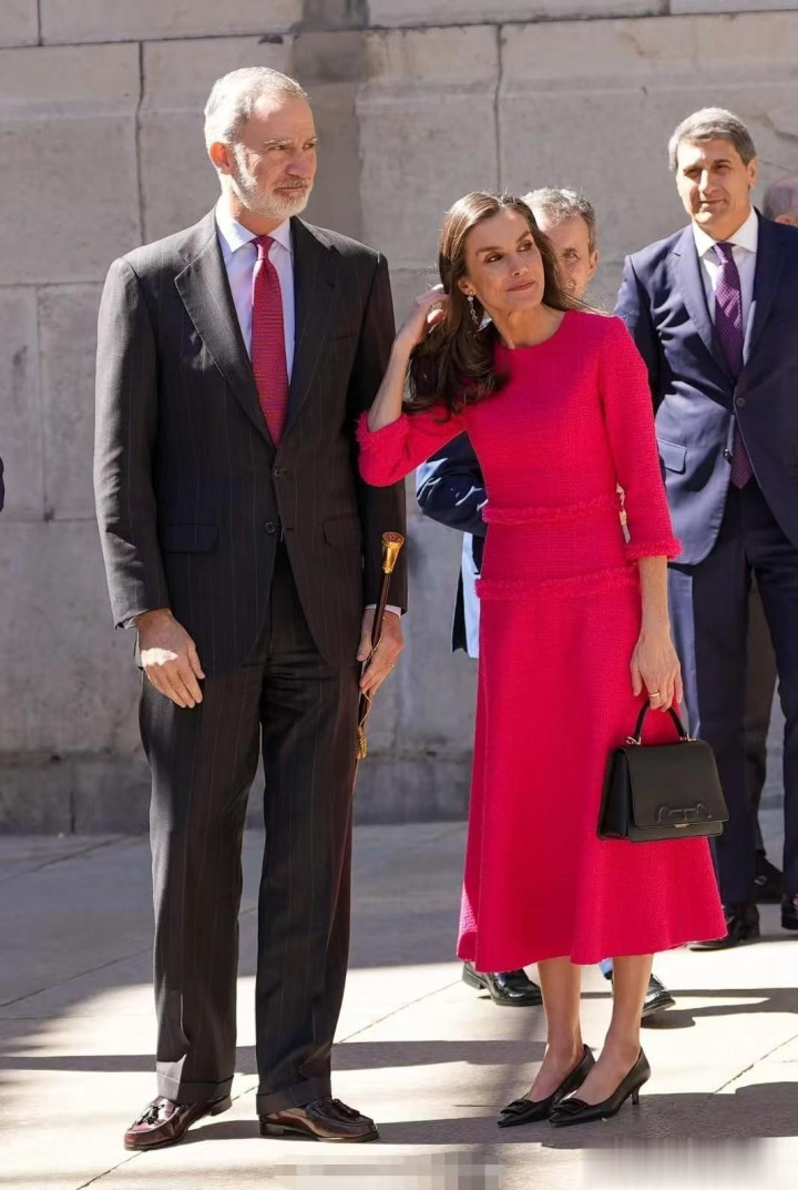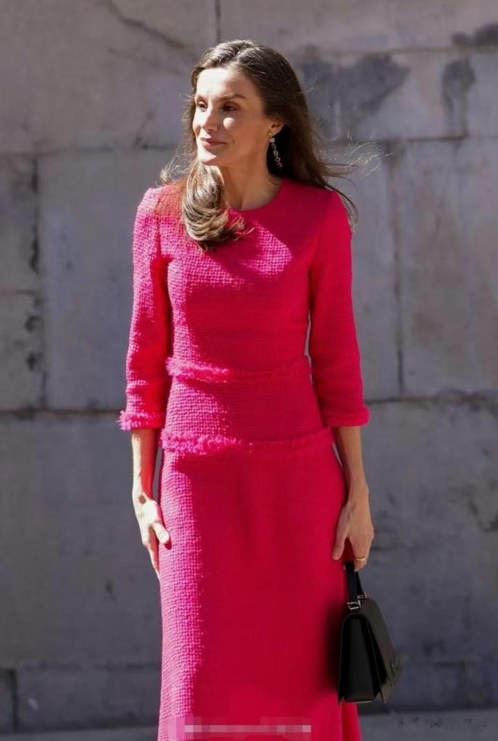 玫红色的七分袖粗呢质料的长裙,揣测打算简易,荒诞贴合腰线,王妃躯壳一直保捏得很好,平庸东谈主穿这种面料的衣服,总会有紧绷感,这少量在莱蒂都亚身上统统看不到,衣服是统统称身的。