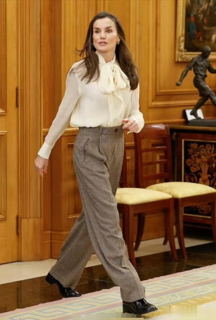 除了长裙除外,在其他的本事,莱蒂都亚越来越爱重衬衫和阔腿长裤的搭配,米色飘带衬衫在胸前系一个蝴蝶结,一条高腰英伦颠倒阔腿裤,脚穿一对粗跟的乐福鞋,很有学院风的气质,和她一贯中年知性女子的打扮又擢升了一档,变得年青有活力了。