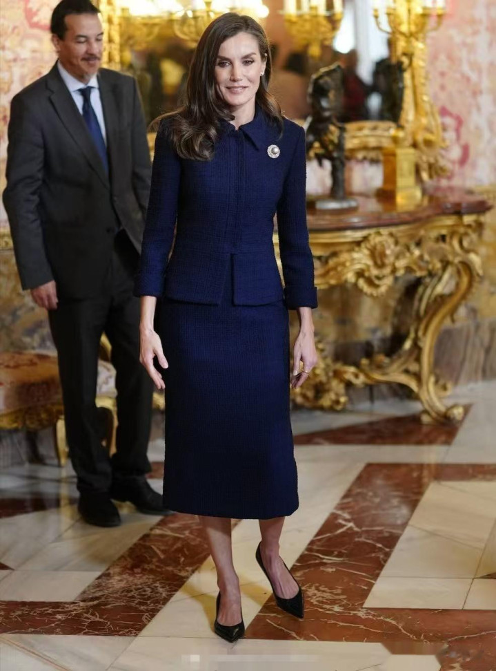和颜色秀丽的长裙比较,藏青色的翻领小套装就显得严谨庄重多了,裙子仍是是过膝的中长款,一条裙子的长度把柄场面不同有颠倒多的谨慎,过膝是最传统保守的名堂,王妃深谙此理。