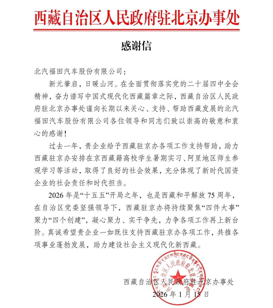西藏驻京办的感谢信,承载着肯定,也寄托着期望。北汽福田将以此为动力,继续以实干诠释责任,以创新驱动发展,奋力书写服务国家、贡献社会的新篇章。