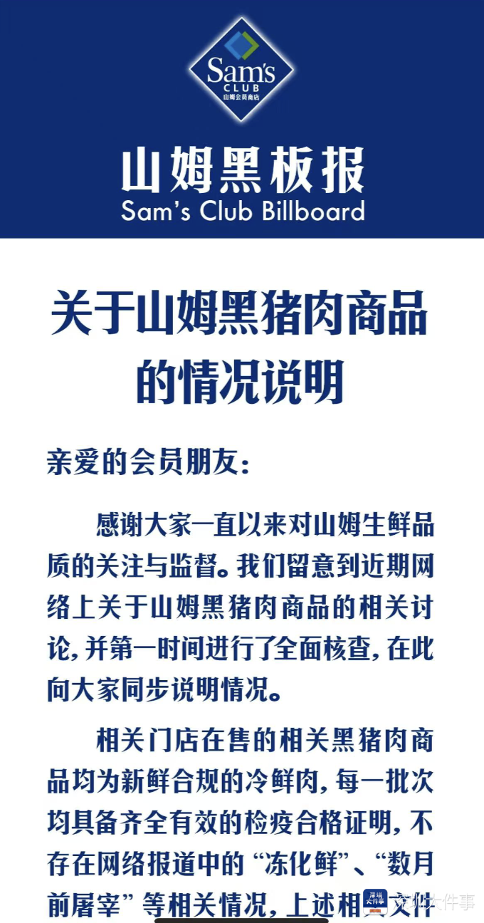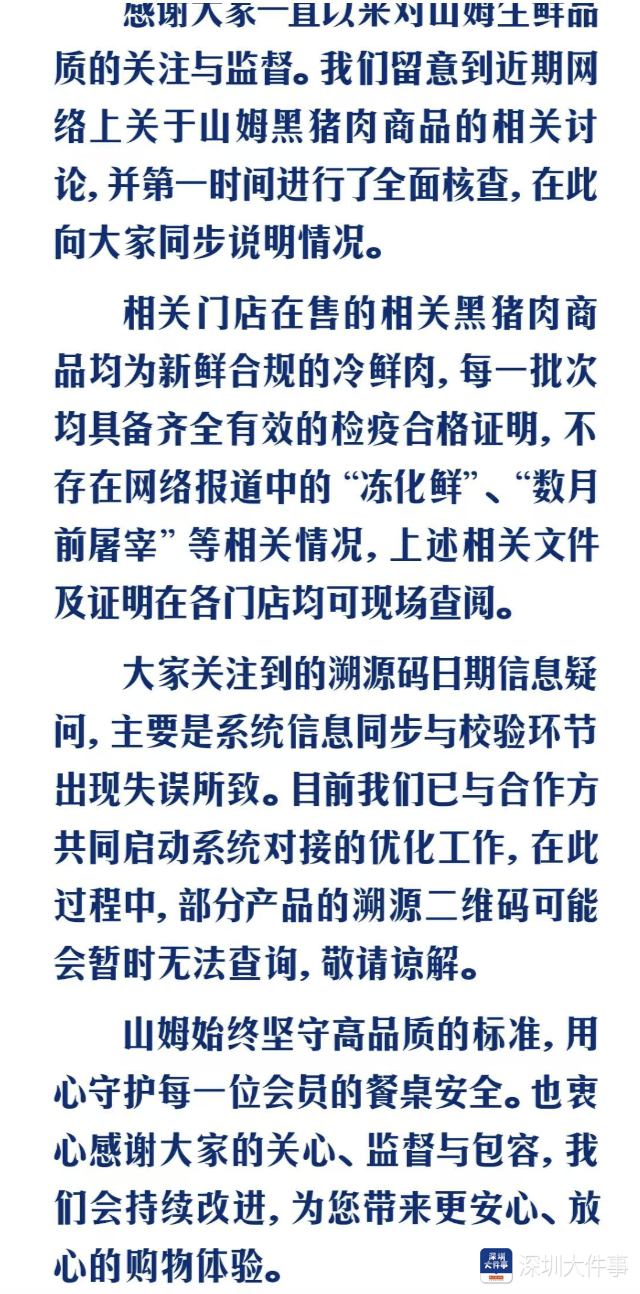 3月22日,南都记者在山姆app看到,山姆发布《对于山姆黑猪肉商品的情况阐明》,其中提到,针对网传情况,山姆第一时分进行了全面核查。关联门店在售的关联黑猪肉商品均为极新合规的冷鲜肉,每一批次均具备都全灵验的检疫及格评释,不存在齐集报谈中的“冻化鲜”、“数月前宰杀"等关联情况,上述关联文献及评释在各门店均可现场查阅。